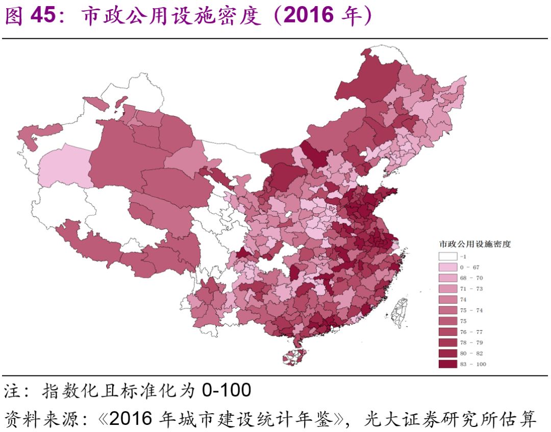 東部和部分西部城市的市政公用設(shè)施水平較高。為了綜合分析各個(gè)城市的市政公用設(shè)施水平,我們使用主成份分析法,選取人均日生活用水量、人均道路面積、人均公園綠地面積,對2016年中國各城市得出了綜合的城市市政公用設(shè)施的總量[27]、密度(圖45-46)和人均水平(圖47-48)進(jìn)行了比較。無論從總量、密度還是人均水平上來看,東部和部分西部城市都比較高,反而是一些中部和東北部城市的城市市政公用設(shè)施水平處于全國比較落后的狀態(tài)。